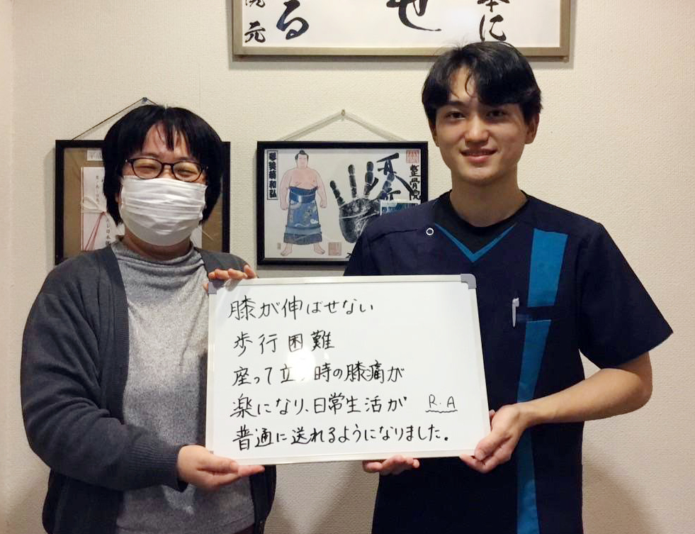 膝が伸ばせない、歩行困難、座って立つ時の膝痛が楽になり、日常生活が普通に送れるようになりました。巻き肩・腰痛の悩み