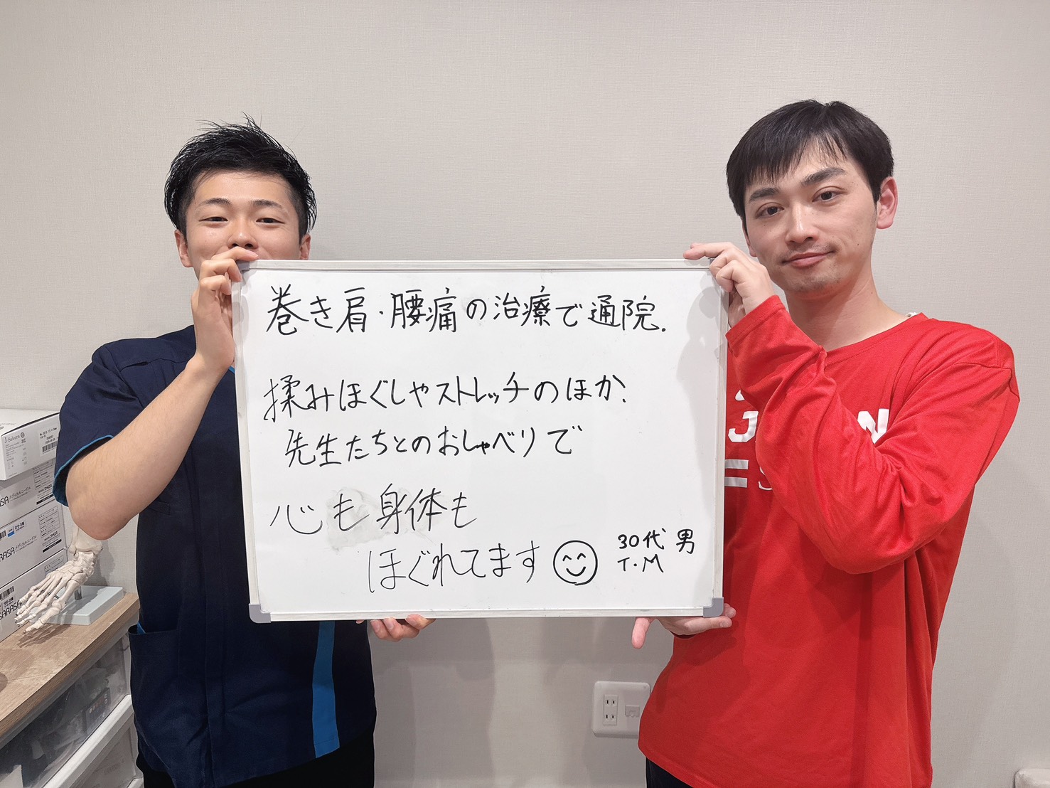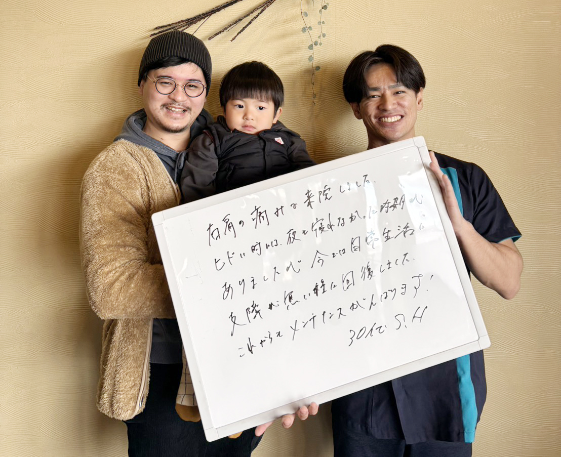 右肩の痛みで来院しました。ひどい時は夜も眠れなかった時期もありましたが、今では日常生活に支障が無い程に回復しました。これからもメンテナンス頑張ります!肩こり頭痛の悩み