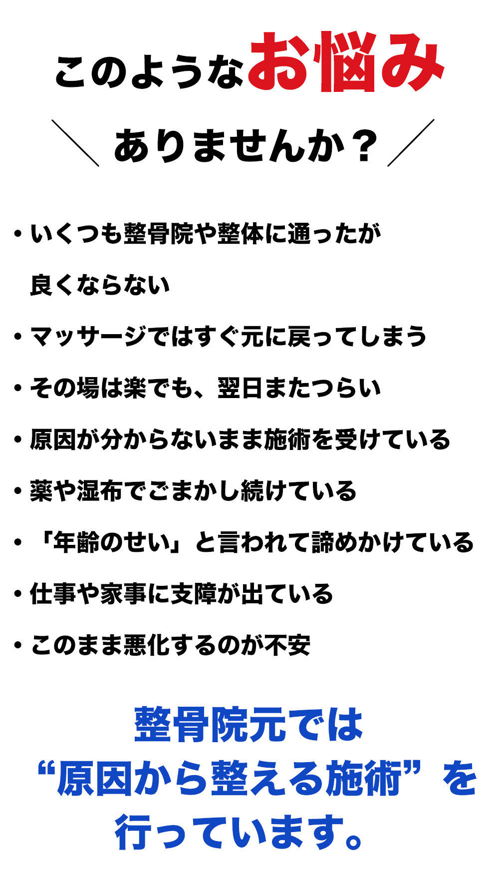 症状や身体の状態は一人ひとり違います。マニュアル施術ではなく、今のあなたに必要な施術を行います。